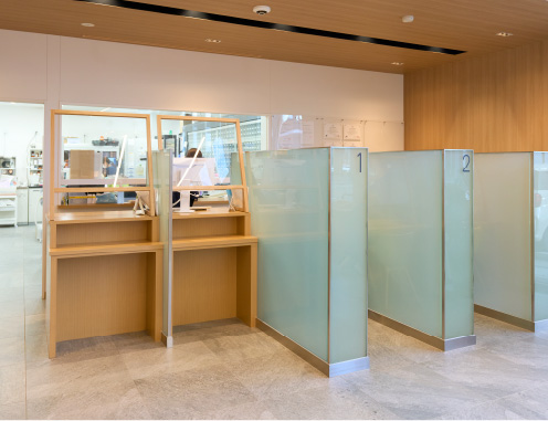 待合室は明るく、開放感のある雰囲気。相談カウンターも間仕切りを設け、プライバシーに配慮。車椅子用のスロープも完備。