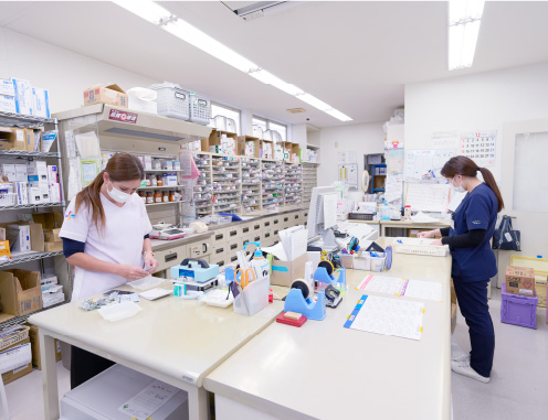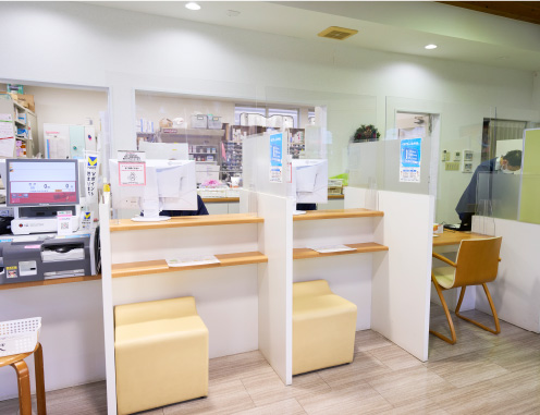 近くに高度な医療機関が多く、患者様への調剤も多岐にわたる。車椅子用のスロープも完備。待合室ではお茶の無料サービスがうれしい。
